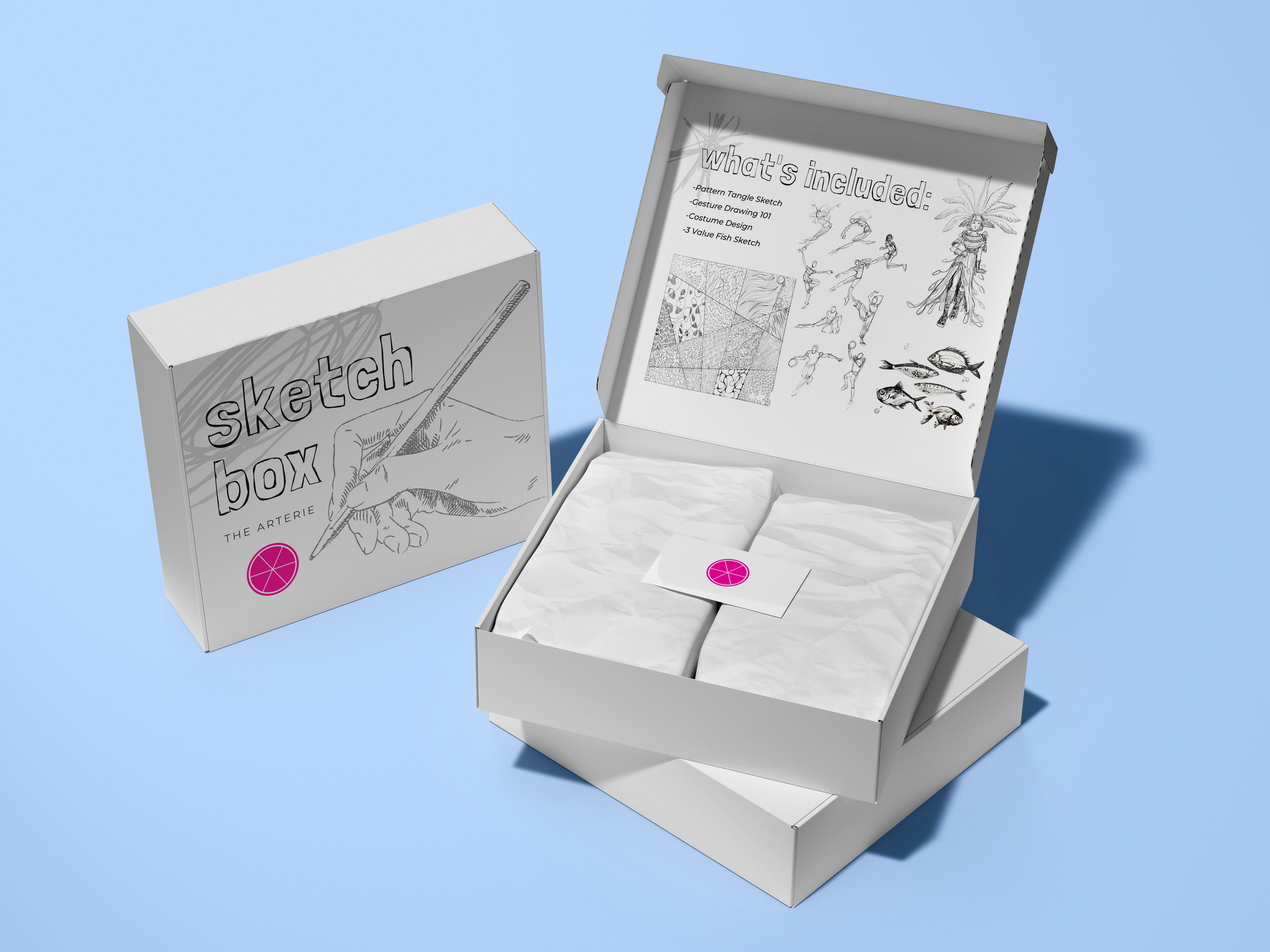 Packaging and insert design for The Arterie’s Art Boxes.